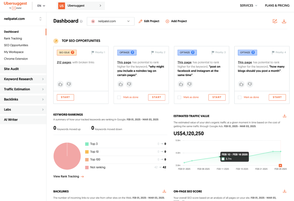 | Ubersuggest | Budget-friendly SEO | Very affordable, easy to use, lifetime pricing option | Data accuracy and depth can be limited | $12/month |