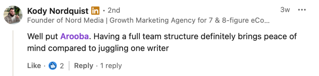 If the freelancer model is about agility, the agency model is about stability. And that stability starts to matter a lot once your content becomes the backbone of your growth engine.