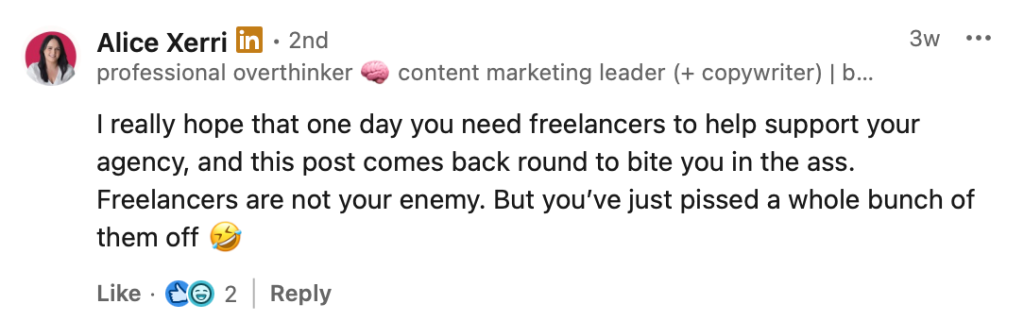 And if you scroll through the comments under that viral post, you’ll see why so many freelancers felt the need to speak up.