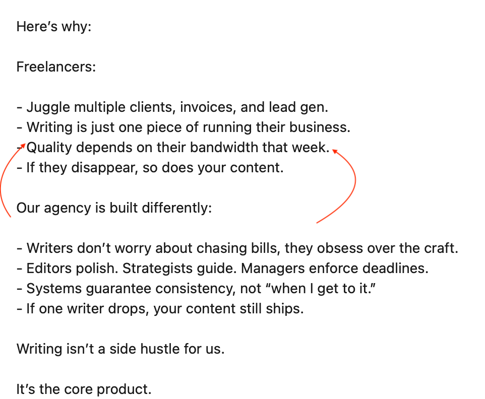 She went on to explain why agencies outperform freelancers, with built-in editors, strategists, and systems that guarantee consistency, and then ended with: