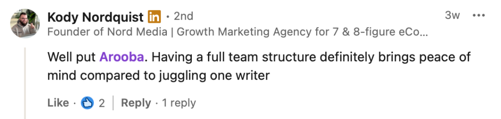 One-on-one communication means faster feedback loops, deeper understanding of the product, and that feeling of having someone who’s truly invested in your brand voice.